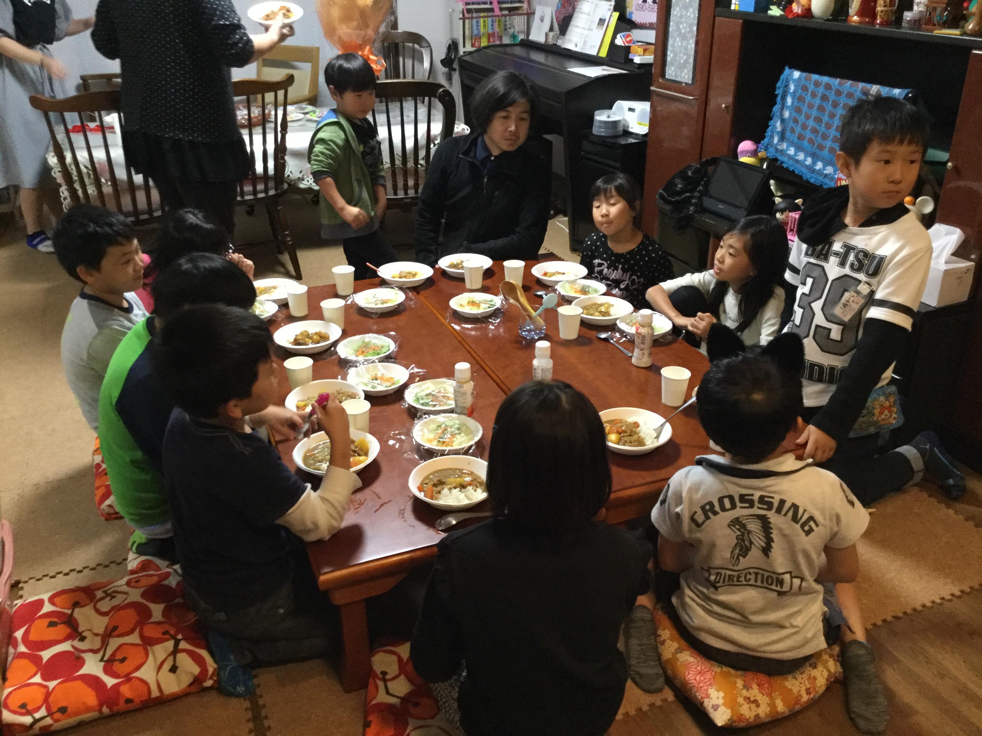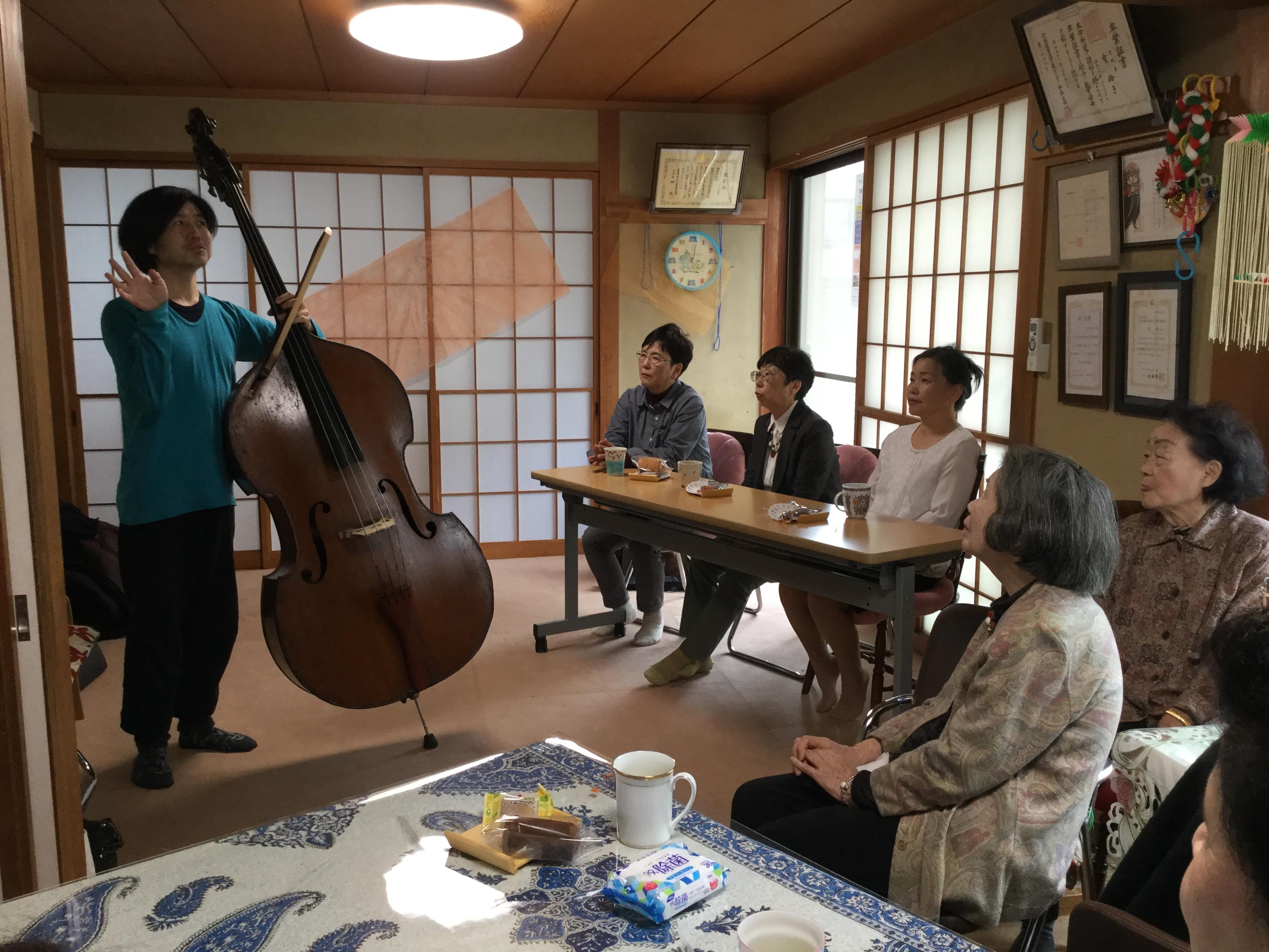 芸術の秋。コントラバス奏者の内山さんと一緒に夕食をとる子ども達。翌日は日和なごみ会メンバーが鑑賞