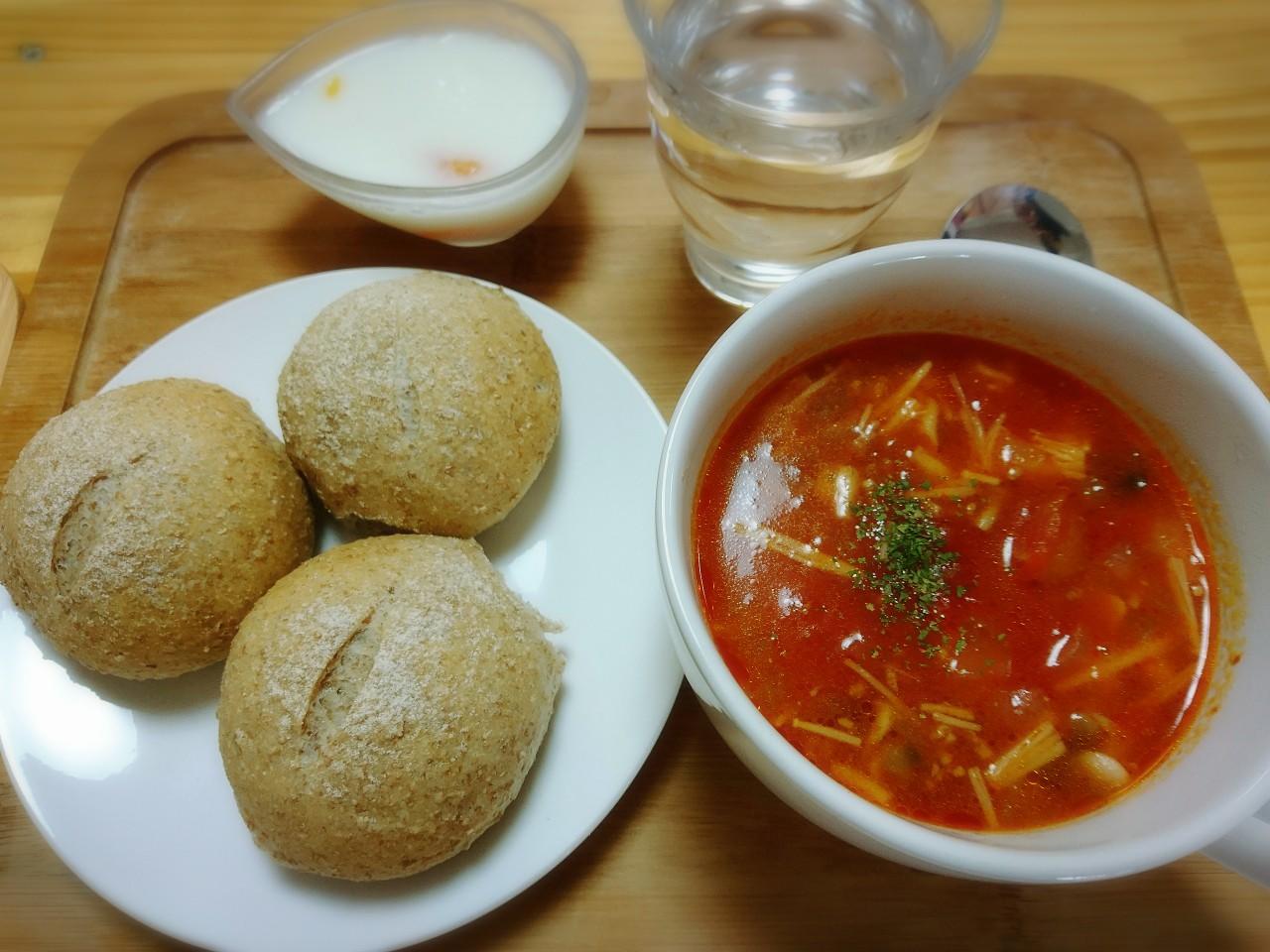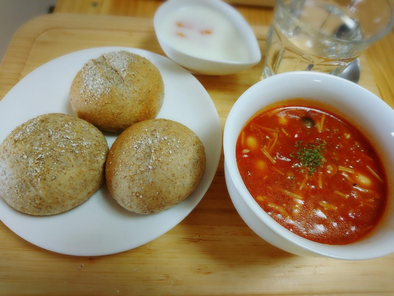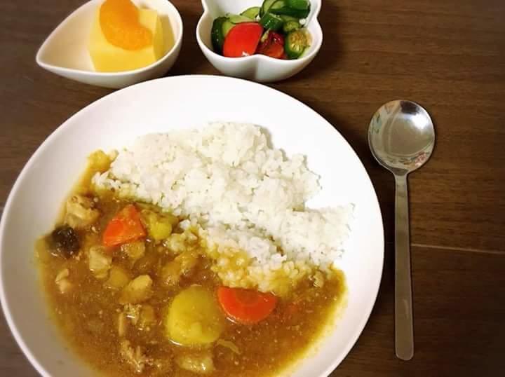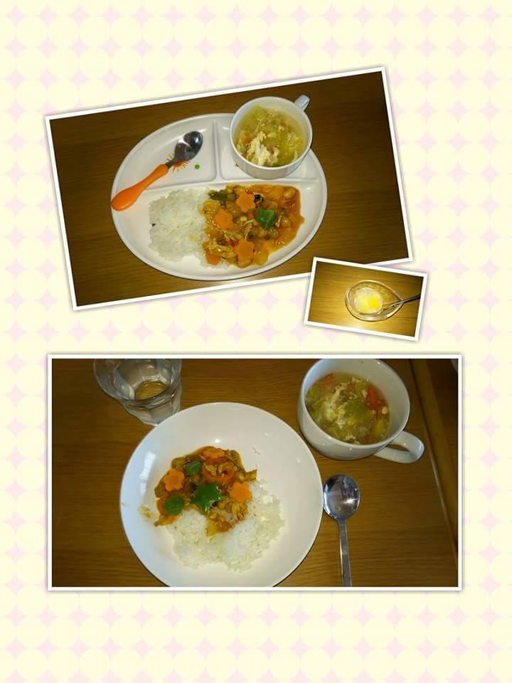 この日のメニューは栄養士の齊藤さんが考えてくれた体にやさしい今日のメニューは、ビーンズドライカレー、トマトのスープ、フルーツゼリー。