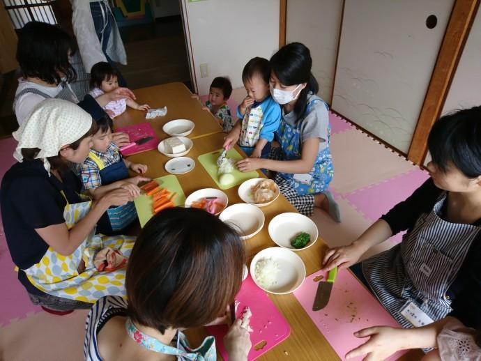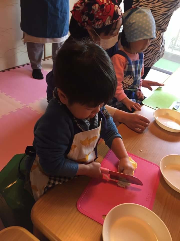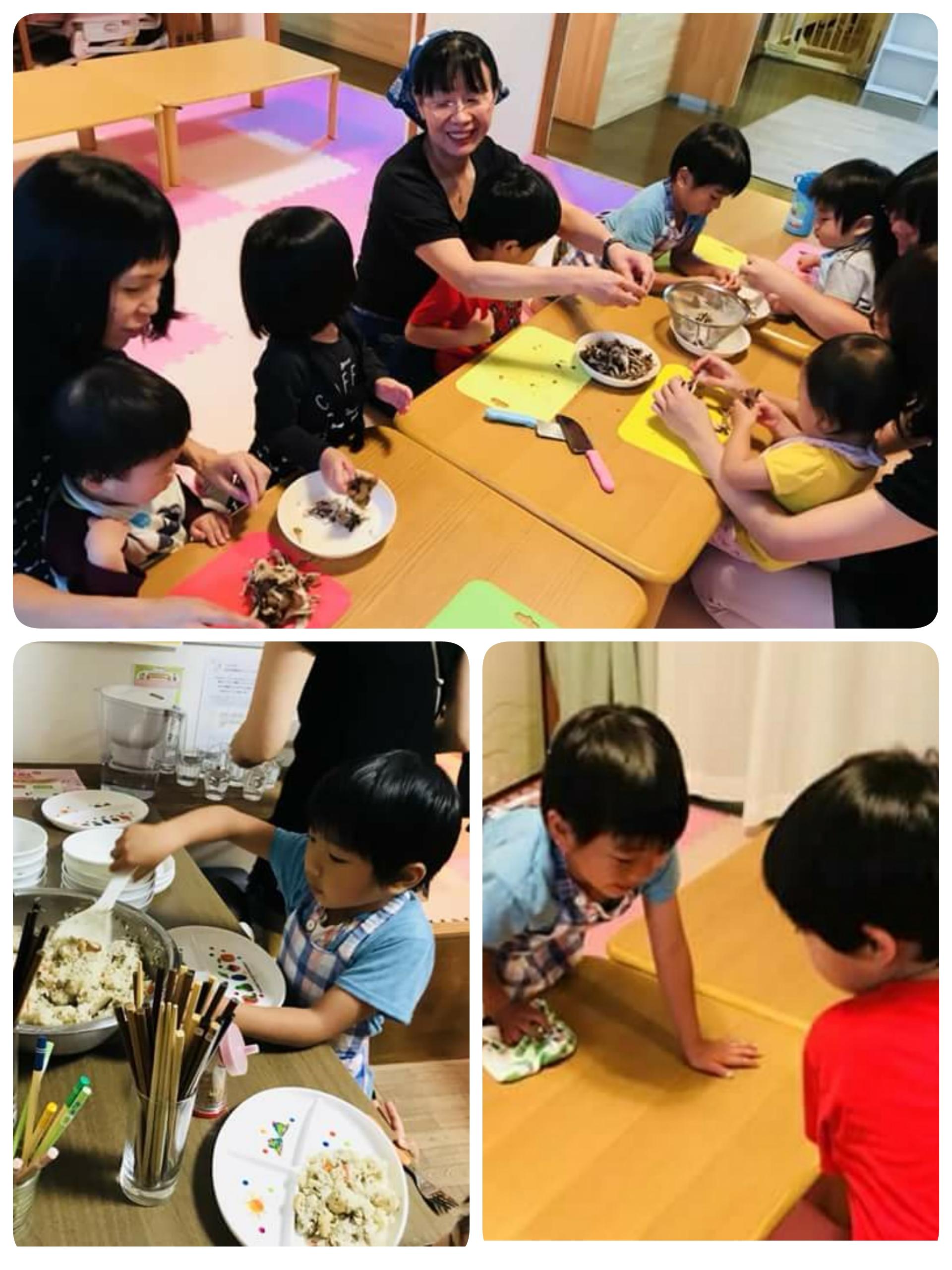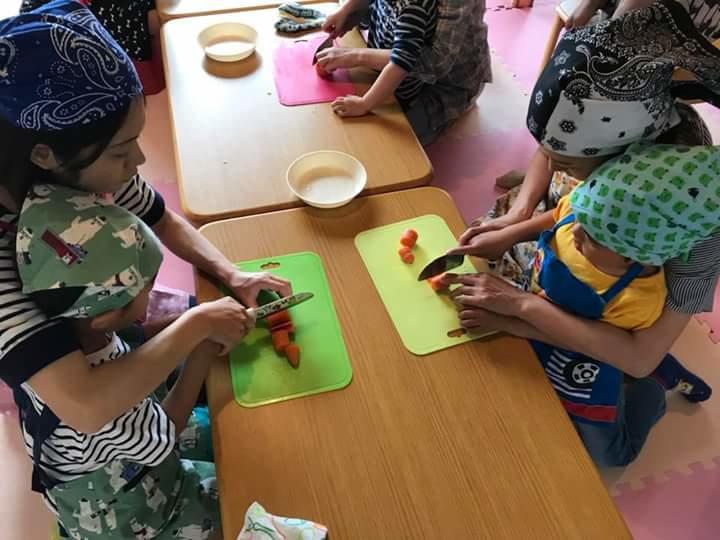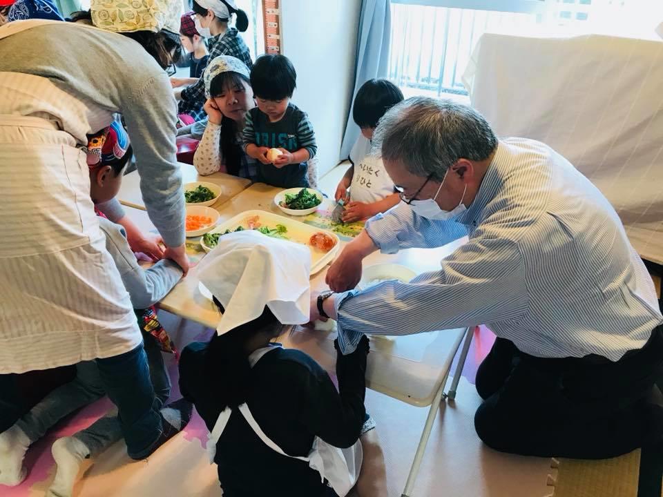 栄養士の斎藤さんがお手伝いしてくださり、親子でお野菜を切ったり、ご飯をよそったり、食器を運んだり、子どもたちにもたくさんお手伝いをしてもらいました。