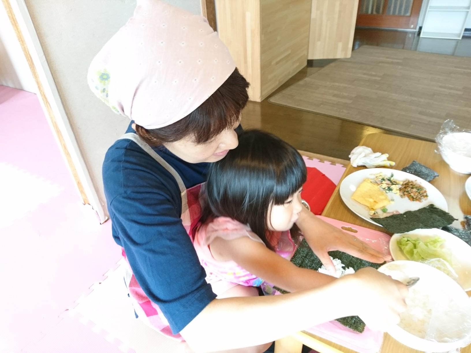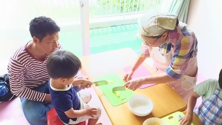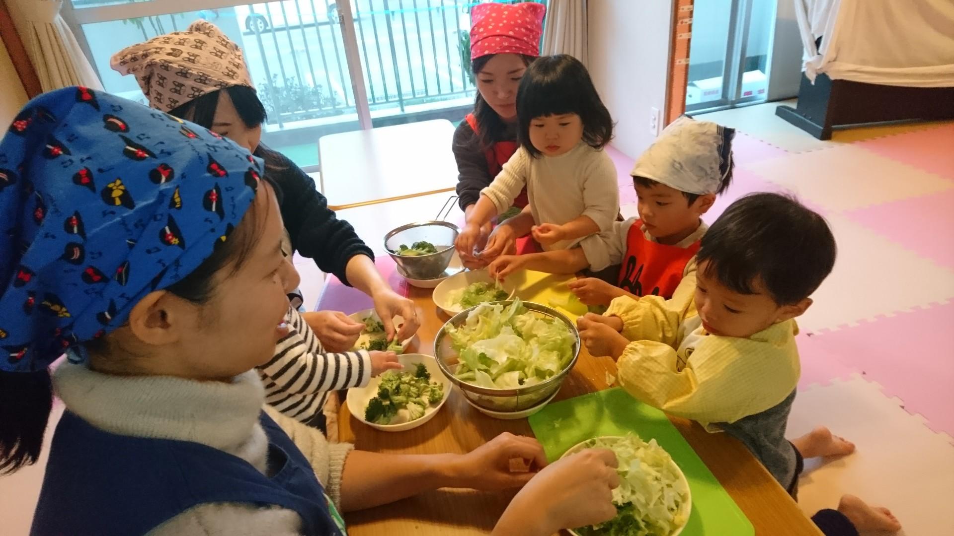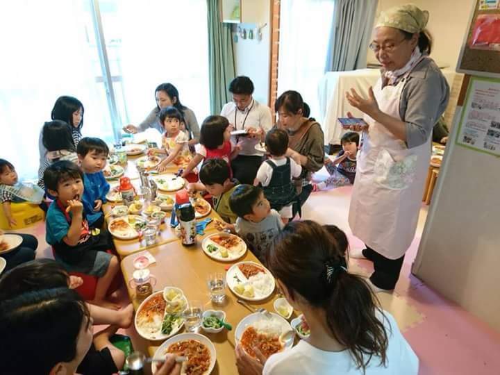 栄養士の斎藤さんがお手伝いしてくださり、親子でお野菜を切ったり、ご飯をよそったり、食器を運んだり、子どもたちにもたくさんお手伝いをしてもらいました。