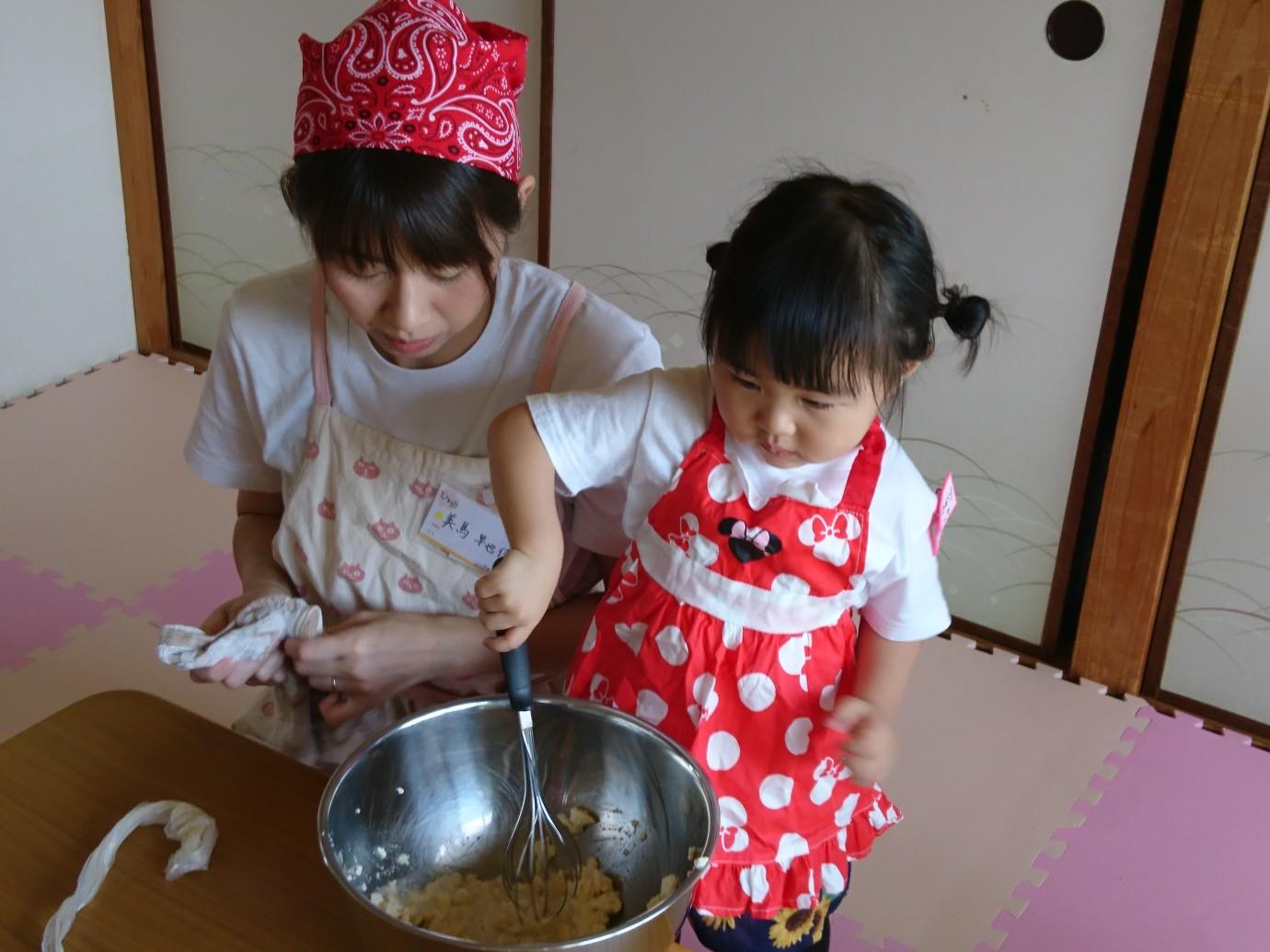 野菜をピーラーでむいたり、ケーキの生地を混ぜたり、バナナをつぶしたり、親子で力を合わせてクッキングを楽しみました。