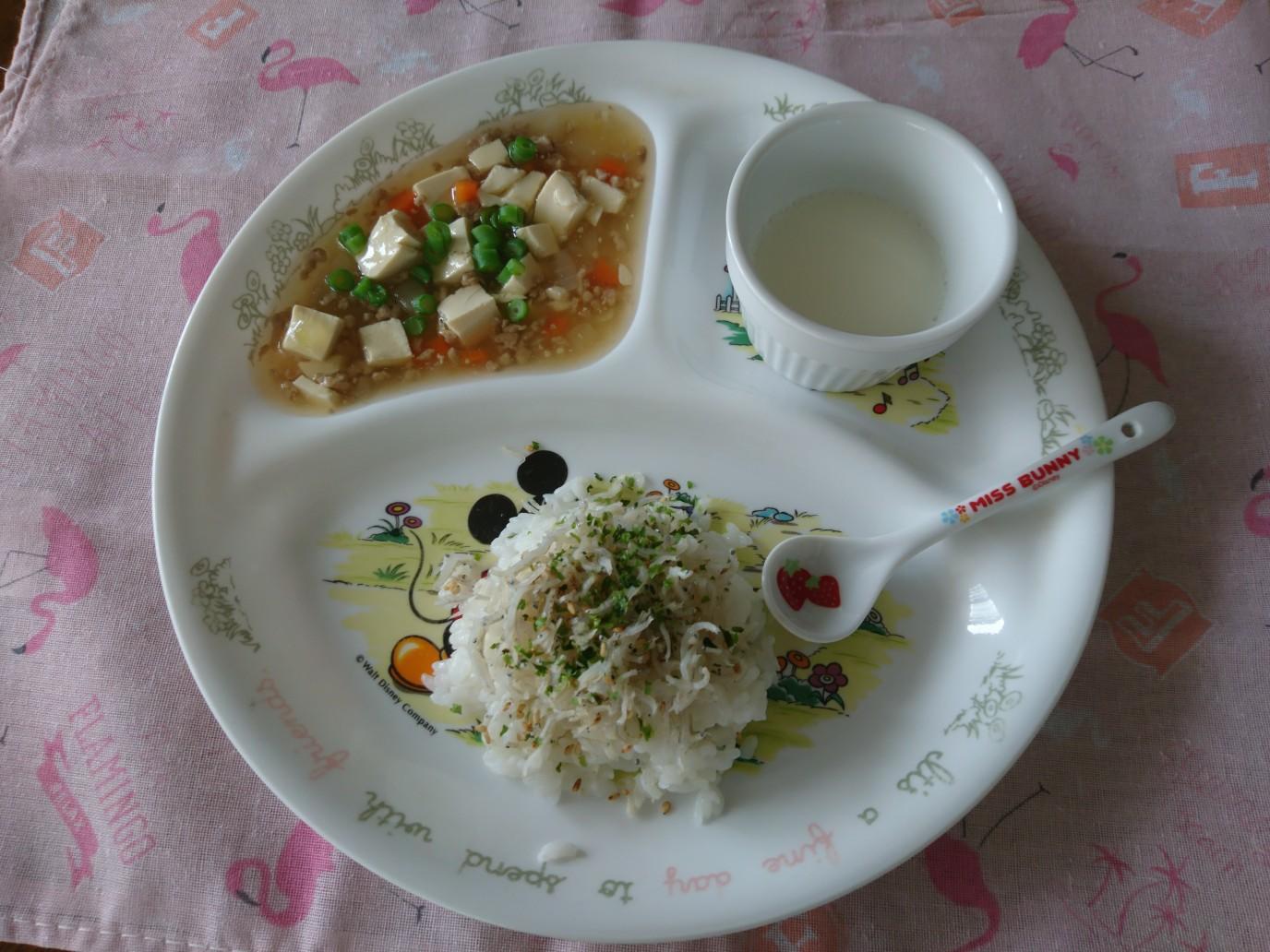 今日のメニューは、カリカリしらすのふりかけごはん、赤ちゃん麻婆豆腐、ふるふる牛乳プリン。