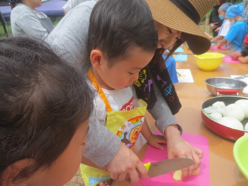 6月9日(日)、2回目となる「絵本の野菜が飛び出した!親子de野菜収穫&青空クッキング」を行いました。今回の旬の野菜は「じゃがいも」。最初の絵本の読み聞かせでは、じゃがいもが主人公の絵本や今回の調理メニューのカレーのお話を聞きました。親子調理では、親子でじゃがいもや玉ねぎを包丁で切る作業をしました。子どもたちが、包丁を握る様子をハラハラと見守るお母さんたちの姿も。カレーを煮込んでいる間、じゃがいもをみんなで収穫しました。土の中からゴロゴロ出てきたじゃがいもにみんな歓声をあげていました。今回、収穫したじゃがいもはそれぞれのご家庭へお持ち帰りです。それぞれのご家庭で持ち帰った野菜を使って、クッキングの時間、親子の時間を過ごして欲しいなと思います。