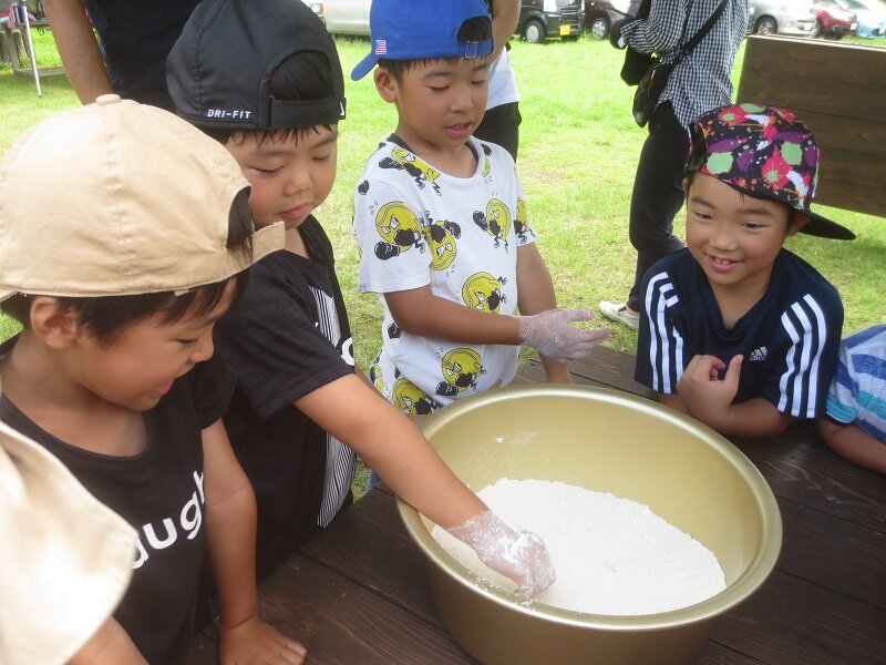 みんなで一緒に生地をこねるのが面白かった。手が真っ白になったけど、生地がモチモチして気持ちよかった。(小学2年生)