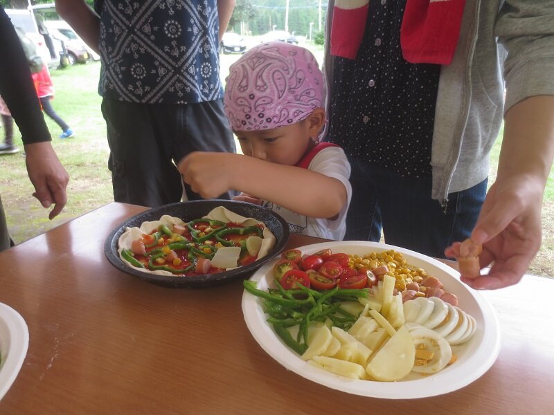 夏野菜を収穫して、カラフルな野菜たちから元気をもらった気がします。親子で一緒にピザを作るのは初めてで楽しく作れました。(保護者)