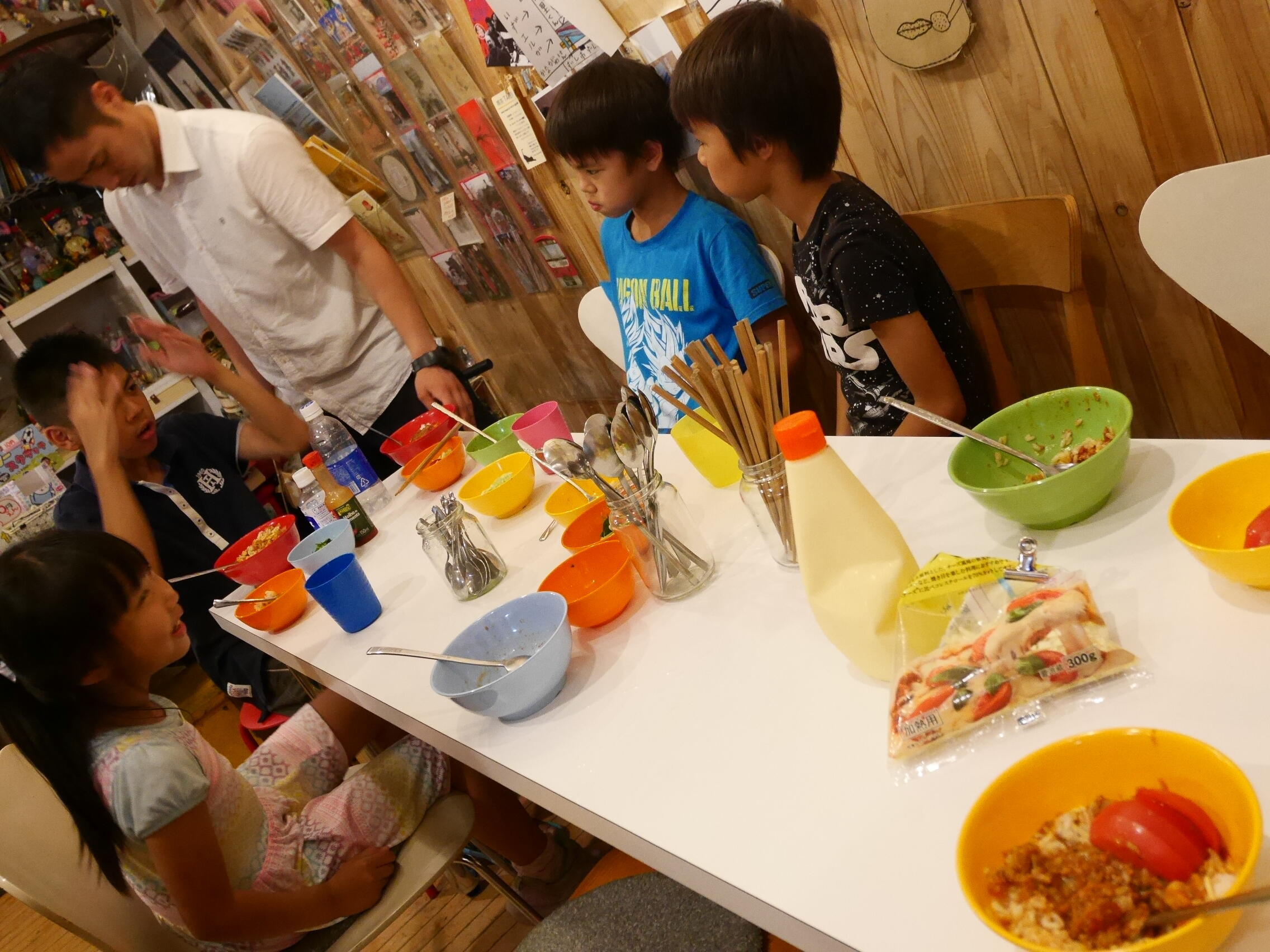 夜に出かけられるせいか、思った以上にみんなノリノリで、午後に作るときよりも、みんな揃って食べられるせいか、なんだかとっても「こども食堂」っぽい。