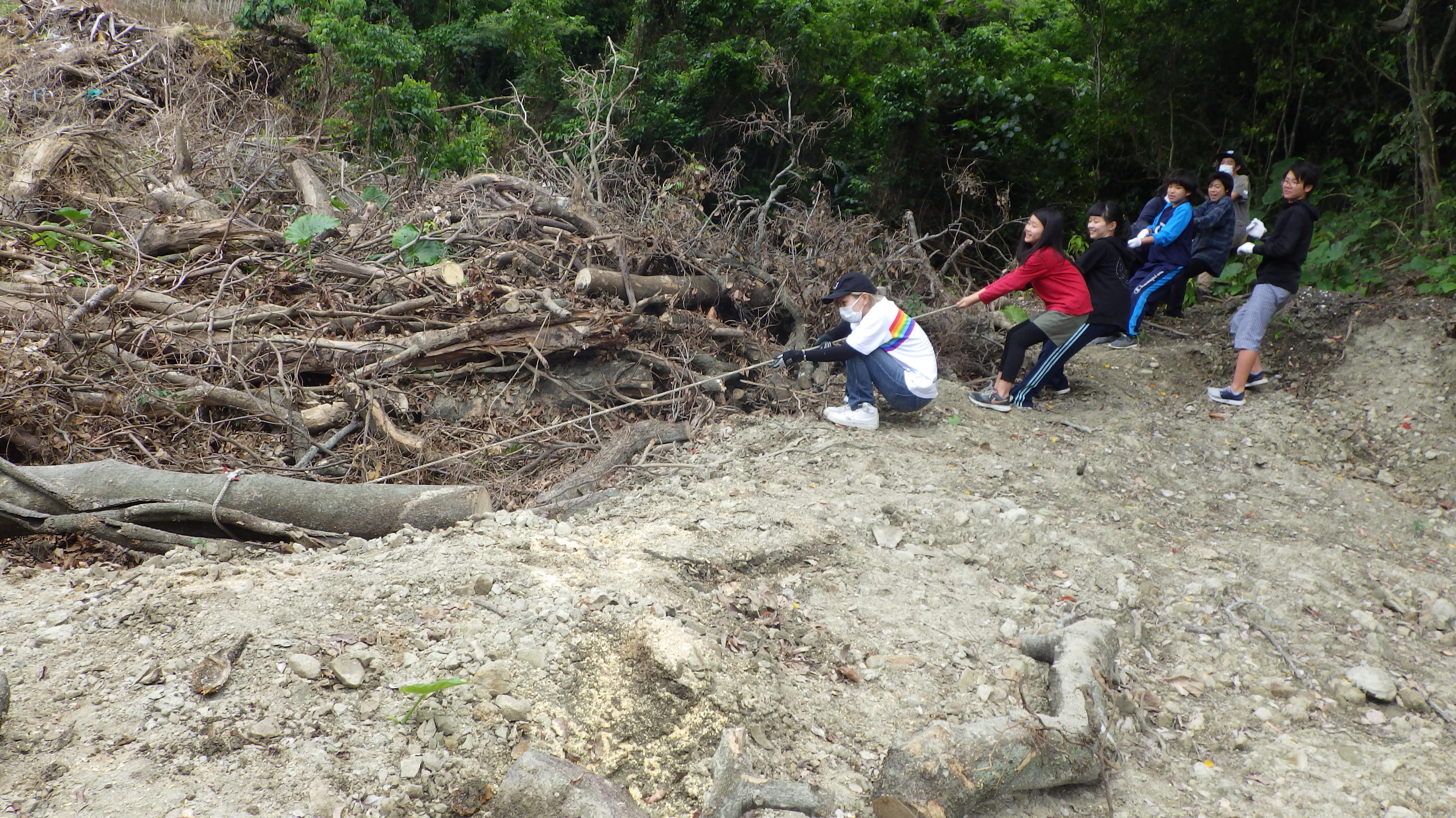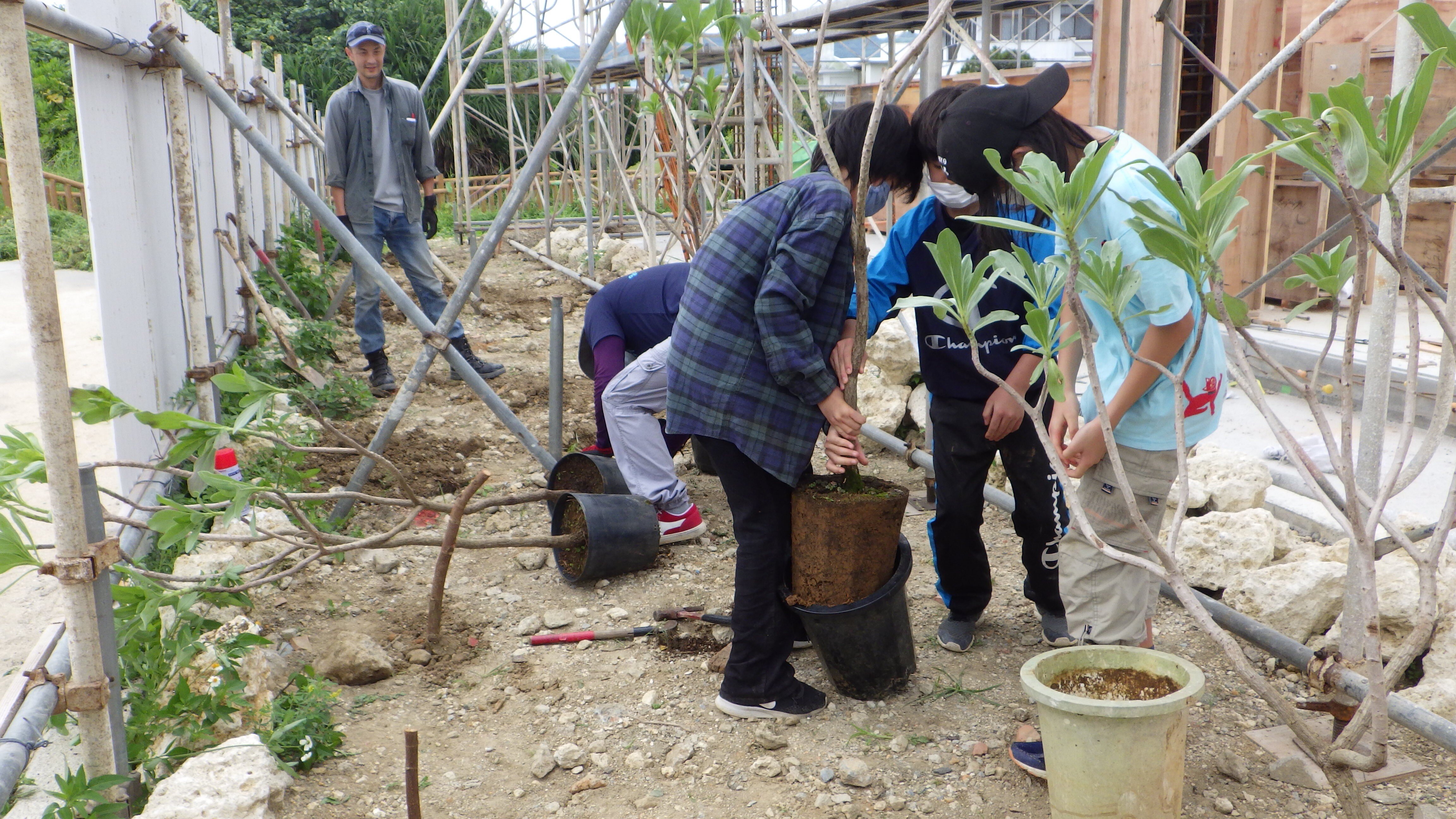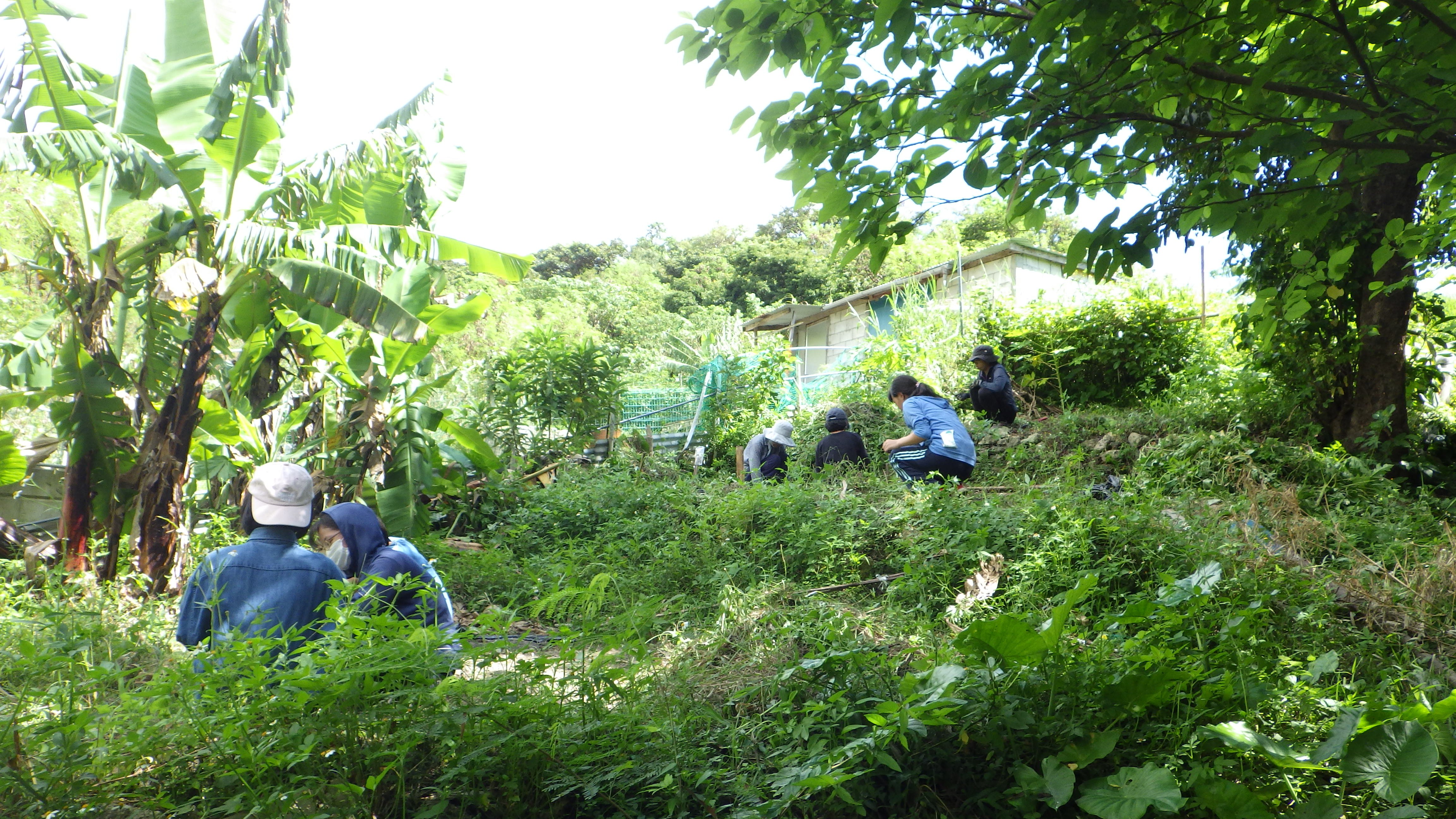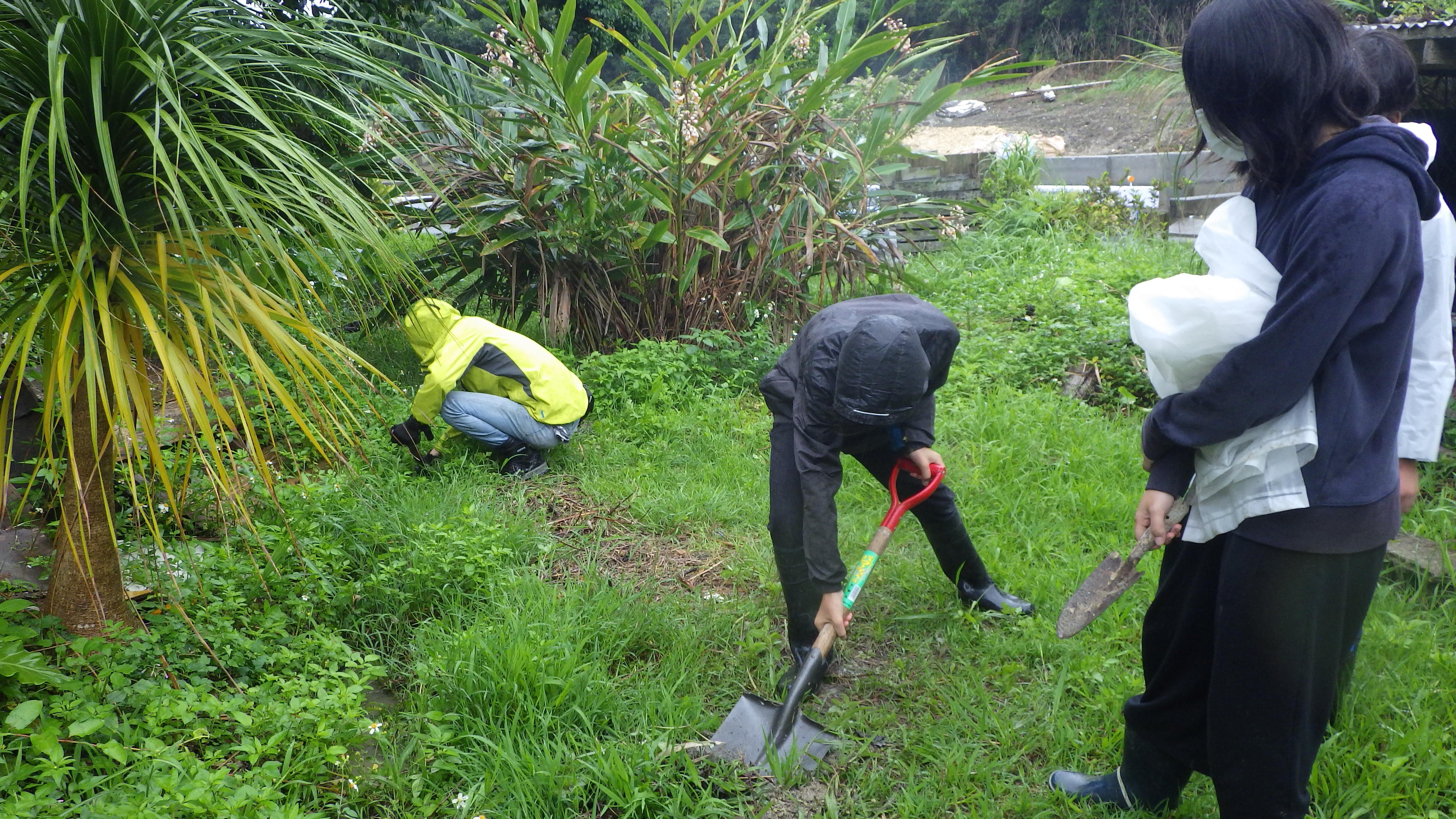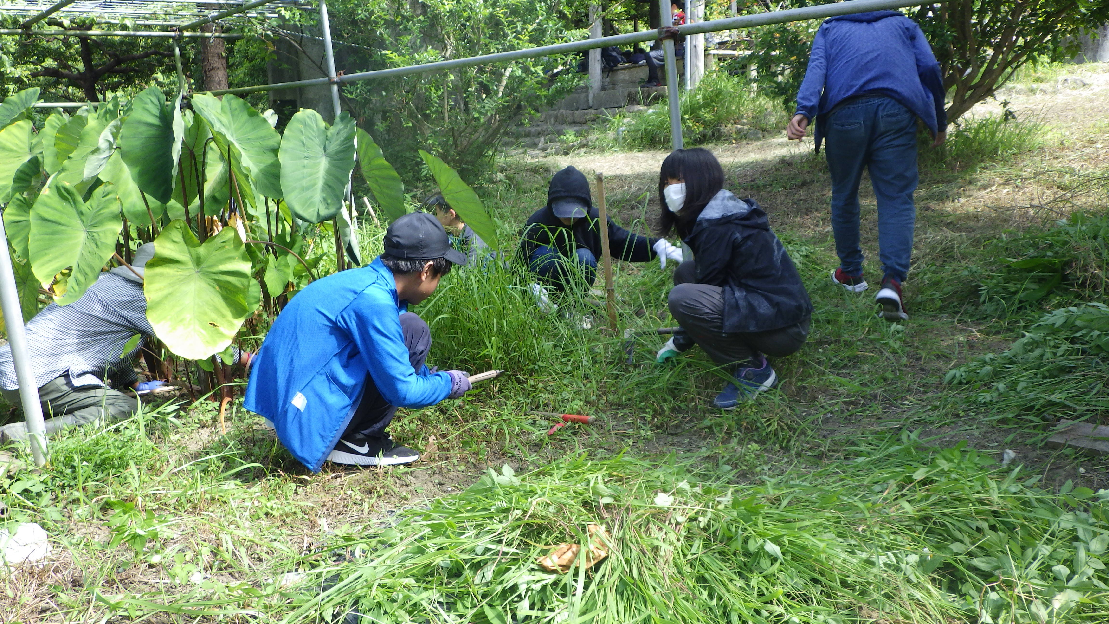再開初日、大雨のため水路の掃除をして早々に引き上げました。5月は2回の活動、最後は新校舎(工事中)の植栽や草刈りをしました。