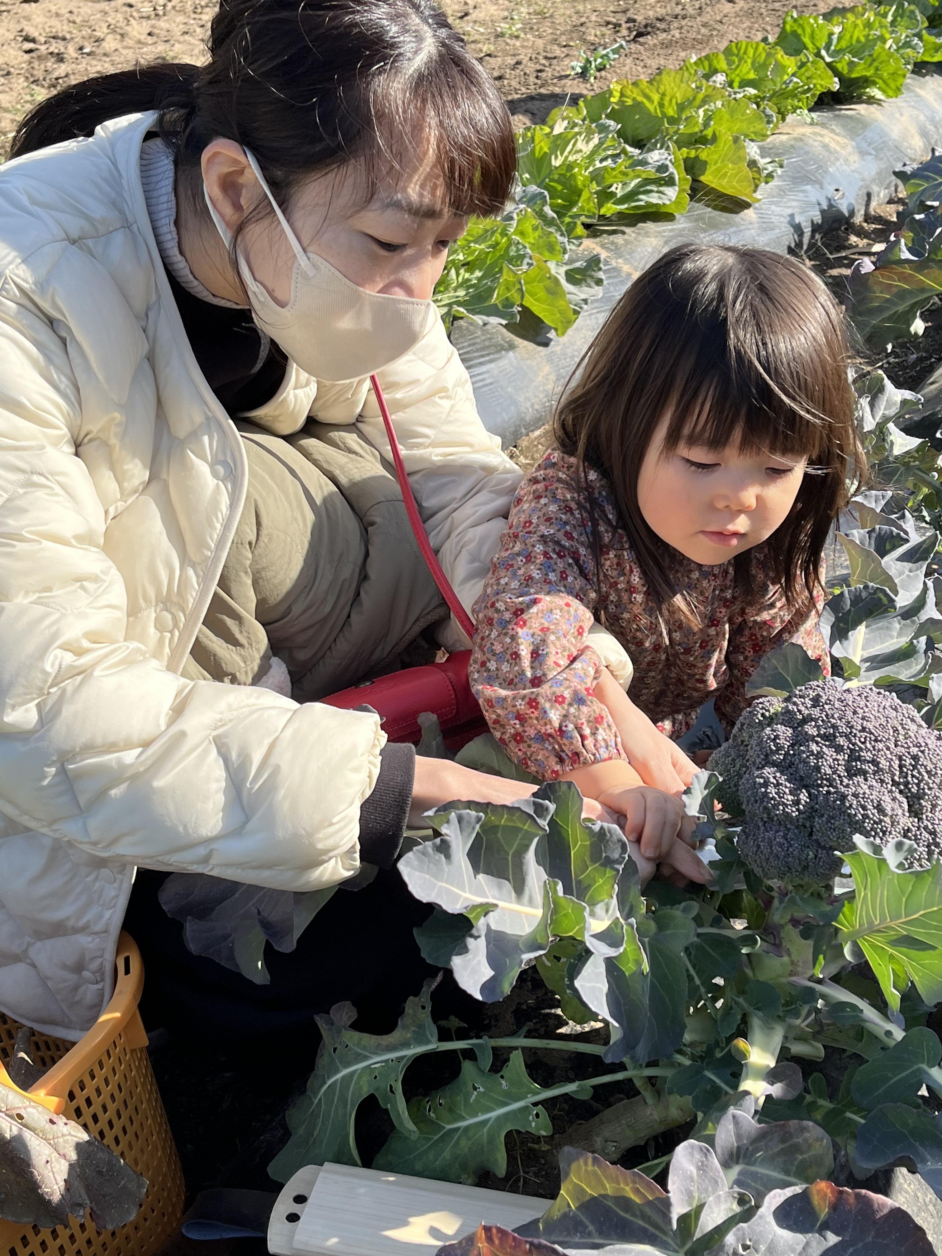冬野菜収穫では、大根、赤大根、ブロッコリー、キャベツ、白菜を収穫しました。今年は、冬の前半が暖かかった為、野菜の成長が早く、大根や白菜、ブロッコリーは大きく育っていました。収穫した野菜で収穫かごはいっぱいになりました。