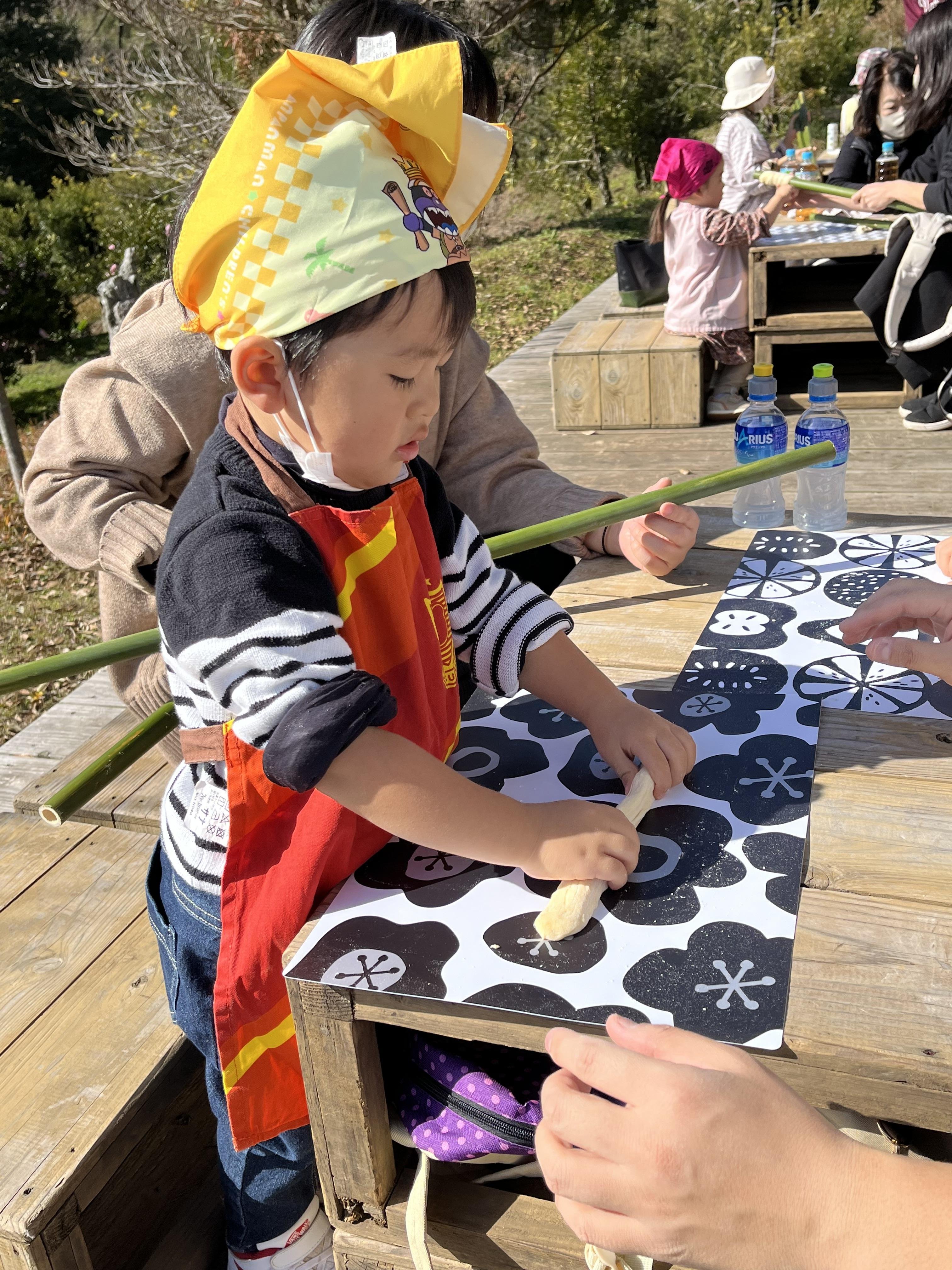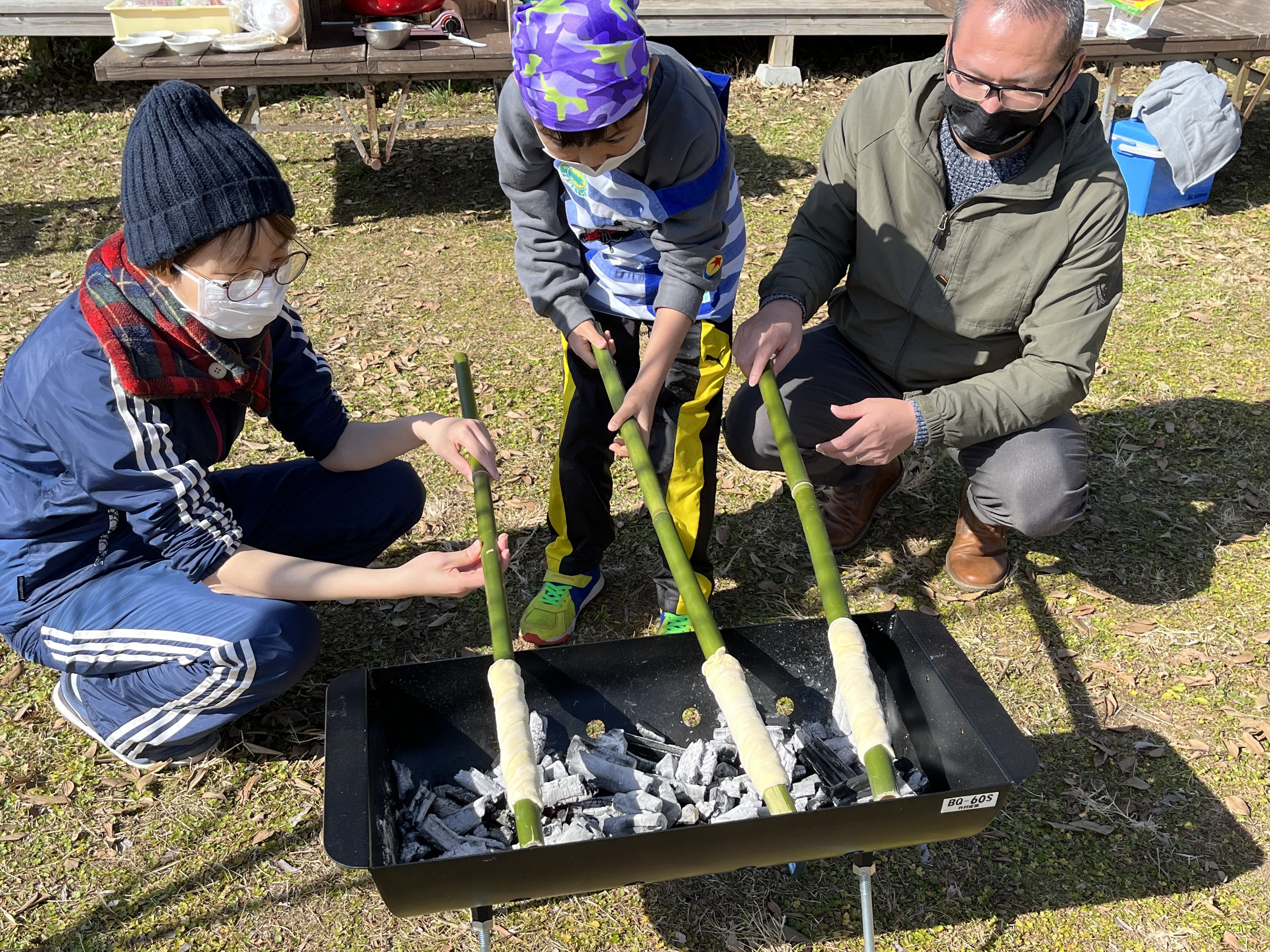昼食のメニューは、野菜たっぷりのポトフとくるくるパンです。パンの発酵した生地を竹の棒にくるくる巻き付け、炭火で焼きます。パン生地を長く伸ばすのがなかなか難しく、お父さんやお母さんに手伝ってもらいながら伸ばした生地を竹に巻き付けました。炭火でゆっくり焼くと、だんだん生地がふっくらしてこんがり美味しそうな匂いがしてきました。焼きたてのパンと収穫した野菜がたっぷり入ったポトフをみんなで食べました。野菜のうまみがたっぷりのポトフは、子どもたちにも好評でおかわりをして食べていました。(計画では、収穫した野菜をみんなで包丁で切り、炒めたものを煮込む予定でしたが、コロナウイルスの感染が増えていることを考慮して今回は調理したものを提供する形になりました)