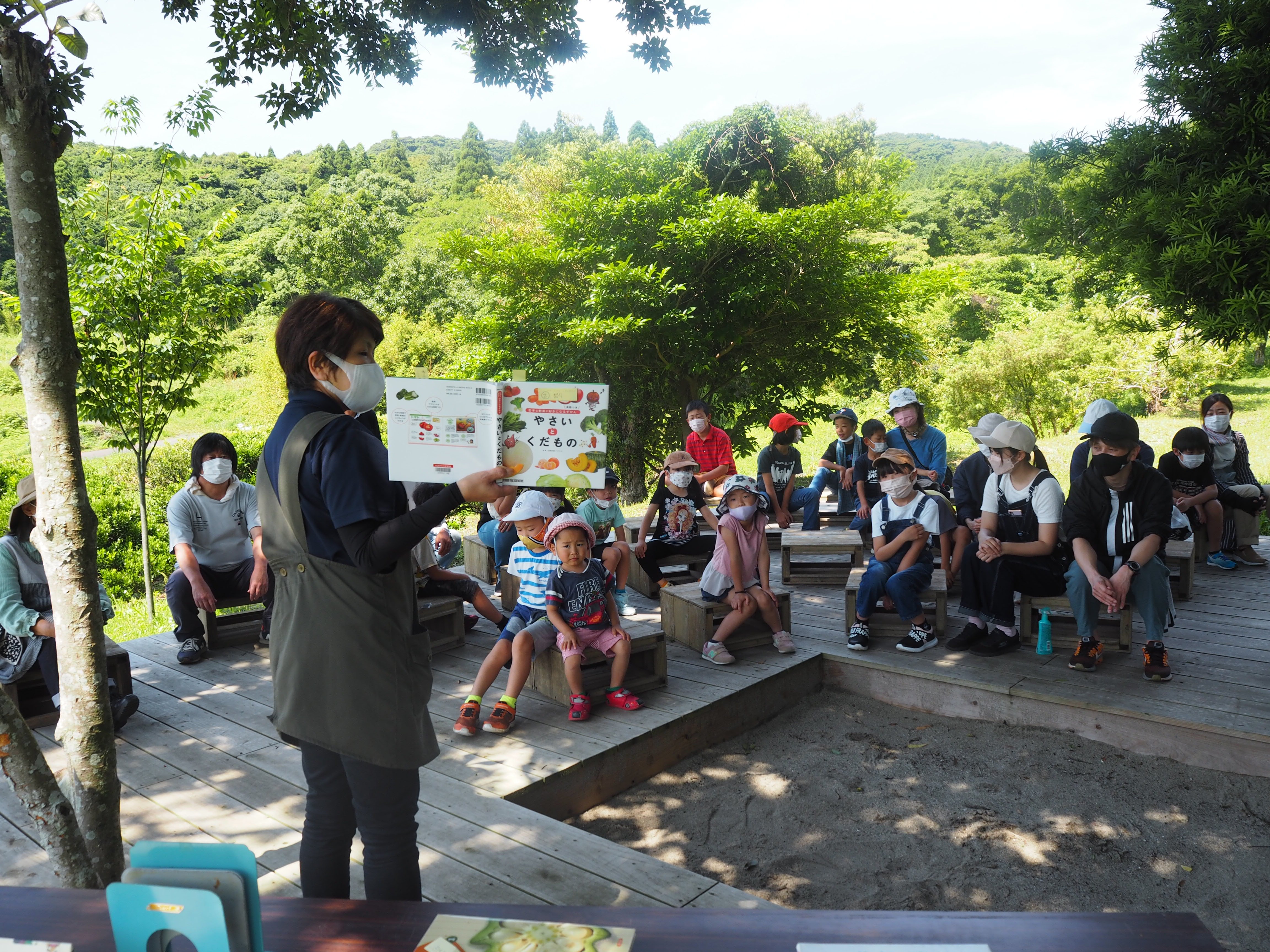 体験当日は、とてもいいお天気でした。ツリーハウスの木陰で枕崎市立図書館の館長さんに収穫するじゃがいもや植え付けする夏野菜の絵本の読み聞かせをしていただきました。野菜に関するクイズも出題され、みんな興味津々でした。