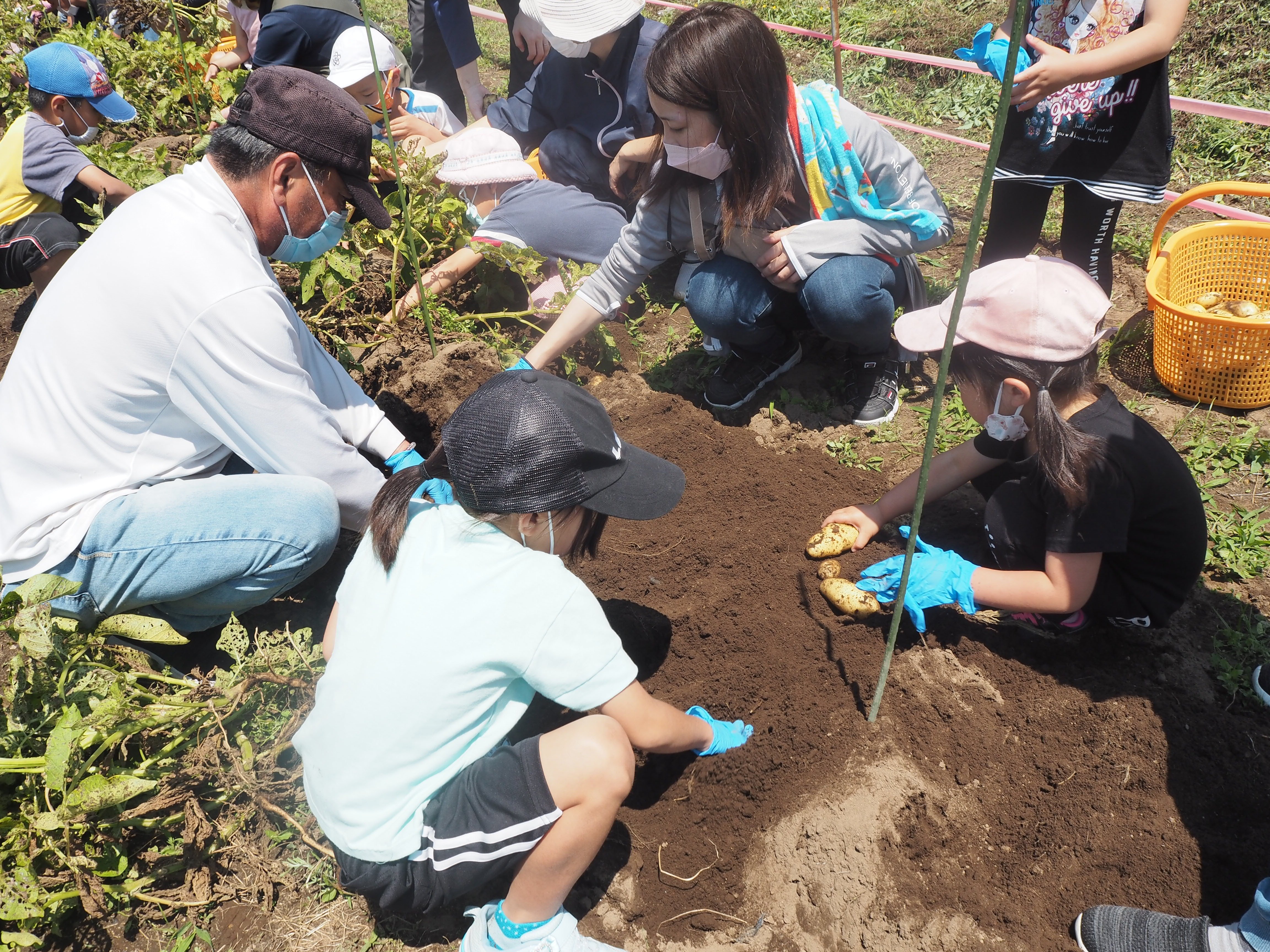 絵本の読み聞かせの後は、じゃがいも収穫をしました。じゃがいもが土の中からゴロゴロ出て来ると、みんな嬉しそうに収穫していました。