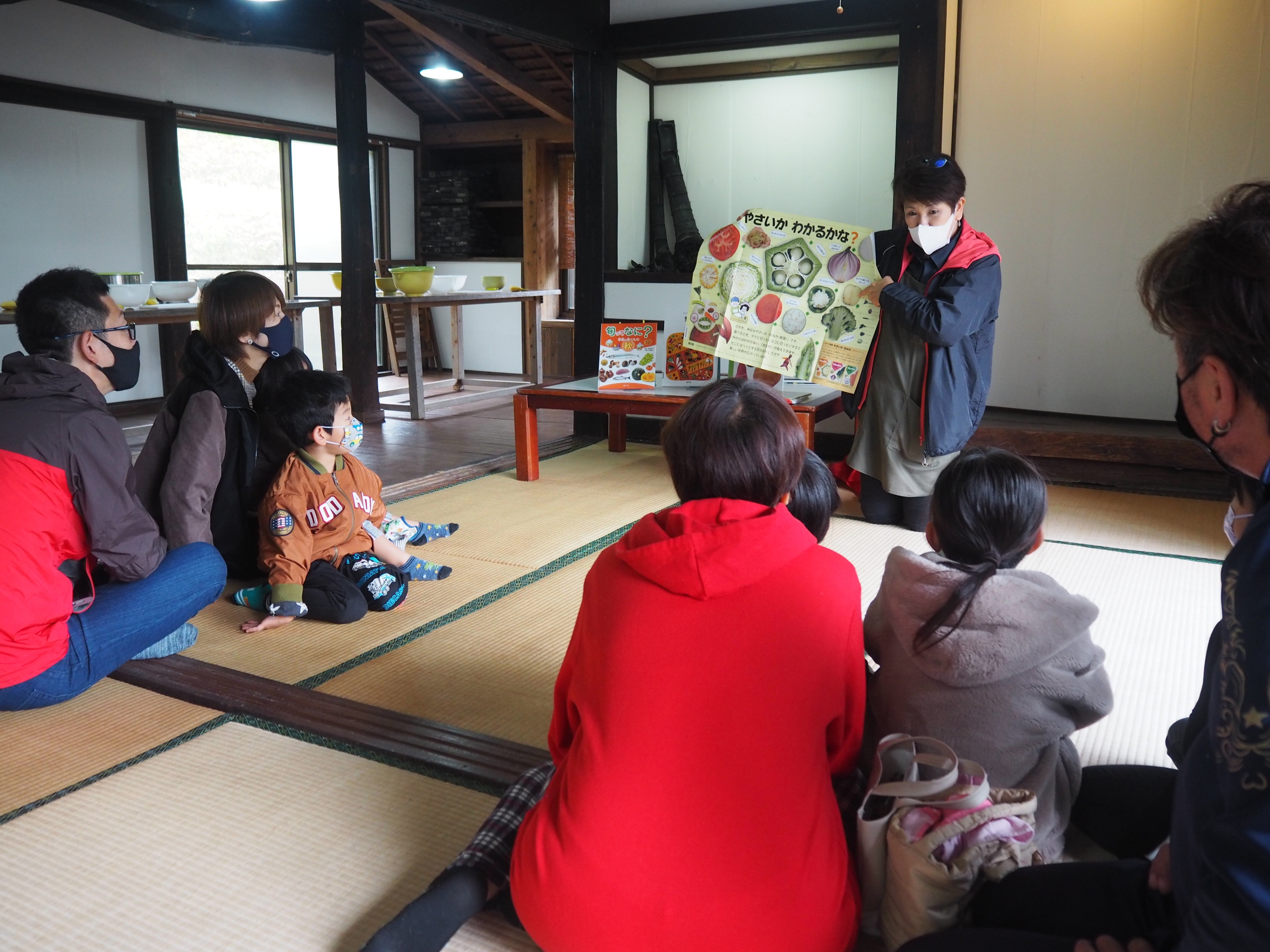 今回の旬の野菜は「冬野菜」。絵本の読み聞かせでは、白菜や大根などの冬野菜が登場する「やさいだワッショイ!おいしさとどけ隊」「どっかんだいこん」「おなべおなべにえたかな」などの絵本のお話を聞きました。