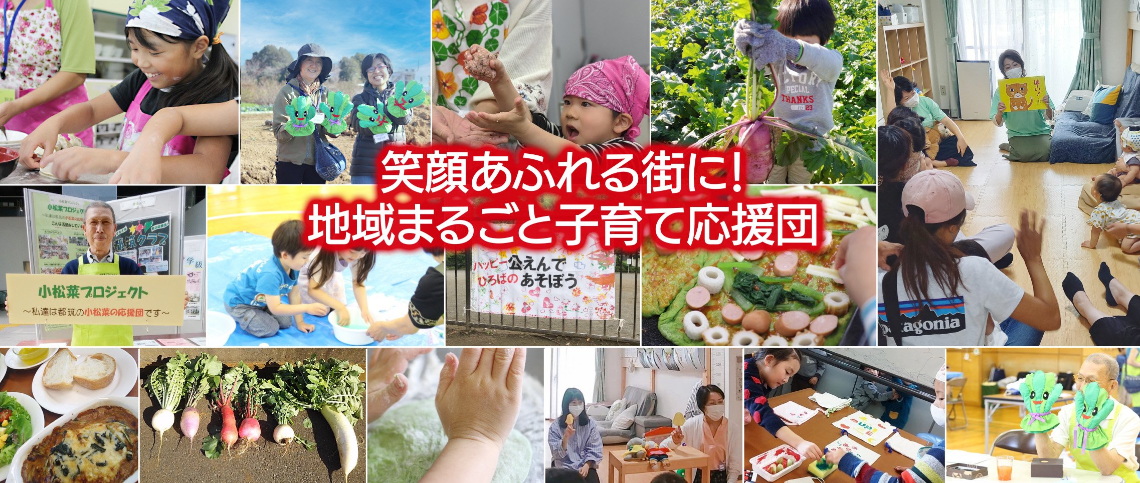 私たちは、親子の居場所づくりを中心とした子育て支援に取り組んでいます。そして、横浜市都筑区を代表する野菜《小松菜》をキーワードとした地産地消の食育活動を通して、笑顔あふれる街づくりを目指しています。