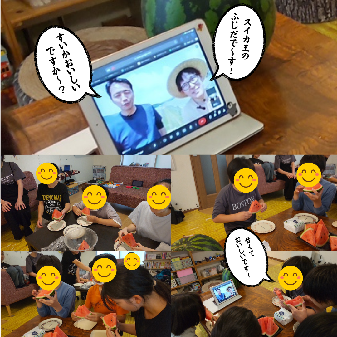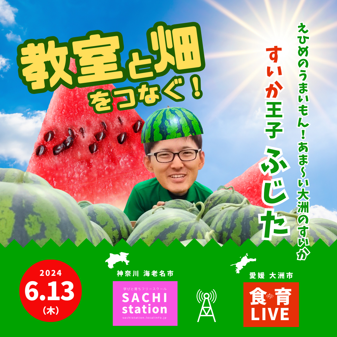 神奈川県のフリースクールSACHIstation様と愛媛県大洲市のすいか農家さんと食育ライブ致しました!愛媛県大洲市はスイカの小さな産地で、水はけのよい土壌から作られるスイカは甘さ温暖な気候から6月から収穫できとても地元でも人気の高いスイカです。そのなかでもスイカ王ふじたさんのスイカは白い皮まで甘みがありシャキシャキ食感が特徴のスイカになります。そのスイカを神奈川県のフリースクールの子ども達に食べてもらいながらスイカの畑を映像で見てもらい、スイカ農家の苦労やこだわりを伝えました。こども達から「甘くとおいしい~」と声を聞くと本当にうれしい気持ちでいっぱいになりました。生産者も、こども達から言われることが最高の喜びになりました!