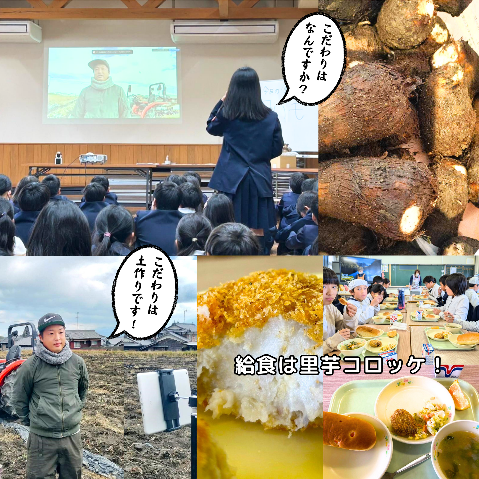 この日は、小学校5年生78名と里芋を育てる農家さんがライブ中継でつながりました。子どもたちは農家さんに質問し、リアルタイムで回答をいただくことで、理解と興味を深めました。後半では「やさいクイズ」として全7問の問題を出題し、その日の給食に出る食材に関する問いかけを行いました。給食の時間には、農家さんが作った里芋を子どもたちが「おいしい!」と喜んで食べる姿が見られ、耳から得た情報がさらに美味しさを引き立てたように思います。