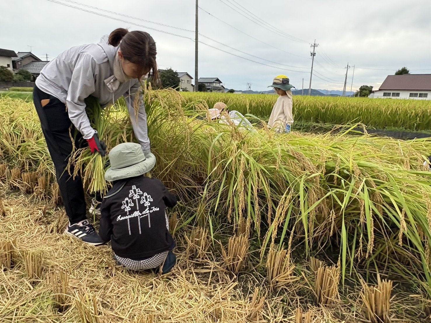 最初はぎこちなかったけれど、だんだん慣れてきて、みんな黙々と稲を刈っていました。