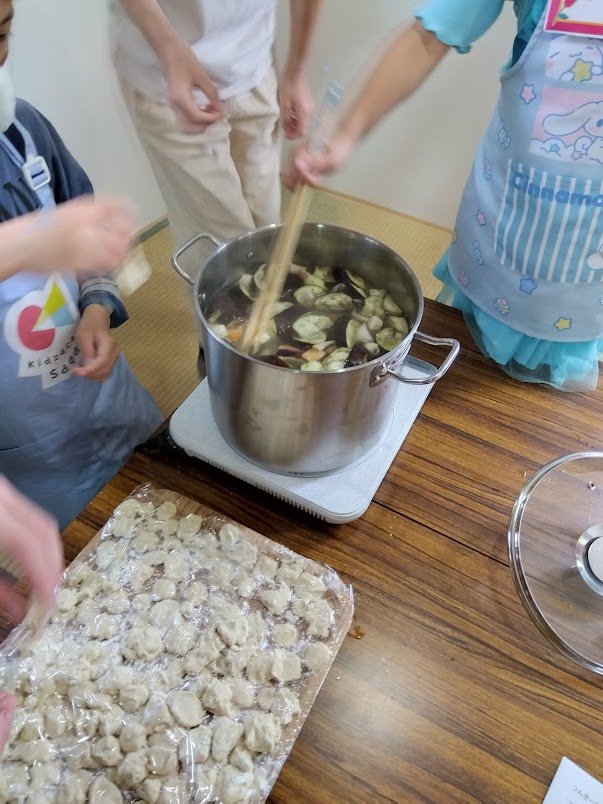 年齢ごとで野菜カット、ちぎる、団子こねる、野菜とお肉を焼くチームに分かれて開始しましたが、更にチャレンジしてみたい工程にも移動して作業できるように回遊式に工夫しました。